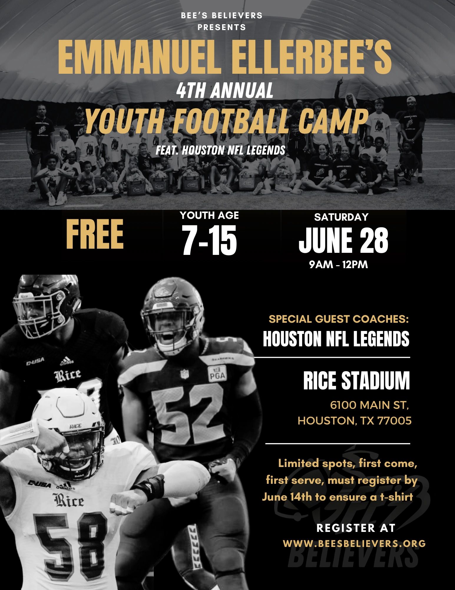 Join us Saturday, June 28th from 9am - 12pm at Rice Stadium for our 4th Annual Emmanuel Ellerbee Youth Football Camp. Check out last year's highlights below and register with the link!